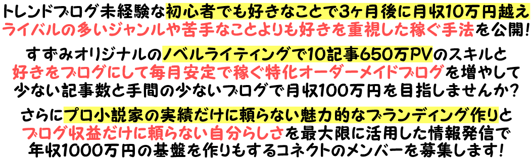 そこで年間コンサル企画「Connect~コネクト~」では、1から知識やスキルを学びながら、一緒に二人三脚で特化ブログを作成していくというわけです。